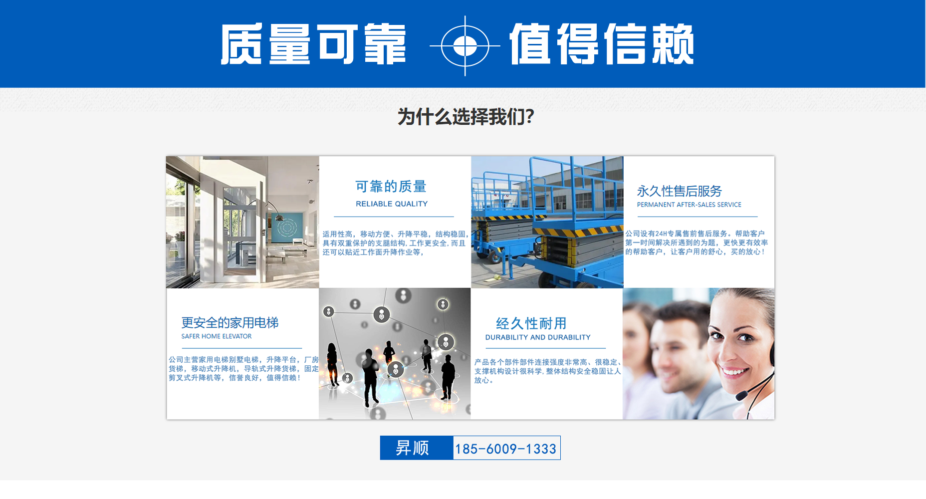 山東昇順液壓升降機(jī)械有限公司是一家主營(yíng)家用電梯,別墅電梯,升降平臺(tái),廠房貨梯,移動(dòng)式升降機(jī),導(dǎo)軌式升降貨梯,固定剪叉式升降機(jī)等產(chǎn)品企業(yè),質(zhì)量可靠,值得信賴。 用戶至上,以用戶為中心”是公司永遠(yuǎn)堅(jiān)持的服務(wù)宗旨,贏得用戶的贊許是我們的榮譽(yù),及時(shí)滿足用戶的需求,是我們公司的愿望。長(zhǎng)期以來(lái),公司員工以優(yōu)質(zhì)的服務(wù),取悅于用戶,以誠(chéng)信的言行取信于用戶,得到了用戶們的好評(píng)。我們期待著與您更加愉快的合作!公司的發(fā)展,離不開社會(huì)的大力支持,在社會(huì)的支持和幫助下,我們正昂首闊步邁向未來(lái)! 我們的經(jīng)營(yíng)方針是:以質(zhì)量求生存,以產(chǎn)品求發(fā)展,以信譽(yù)保合作,以服務(wù)贏客戶。 本公司對(duì)產(chǎn)品質(zhì)量和各項(xiàng)服務(wù)恪守合同承諾,并愿與新老客戶精誠(chéng)合作,共創(chuàng)未來(lái)。 公司精神:創(chuàng)新是主題,超越是不懈的追求。 公司宗旨:信譽(yù)保證,誠(chéng)信為本。 我們會(huì)以合理的價(jià)格,良好的信譽(yù),雄厚的實(shí)力,優(yōu)質(zhì)的產(chǎn)品,最周到的服務(wù),服務(wù)于廣大新老客戶!...